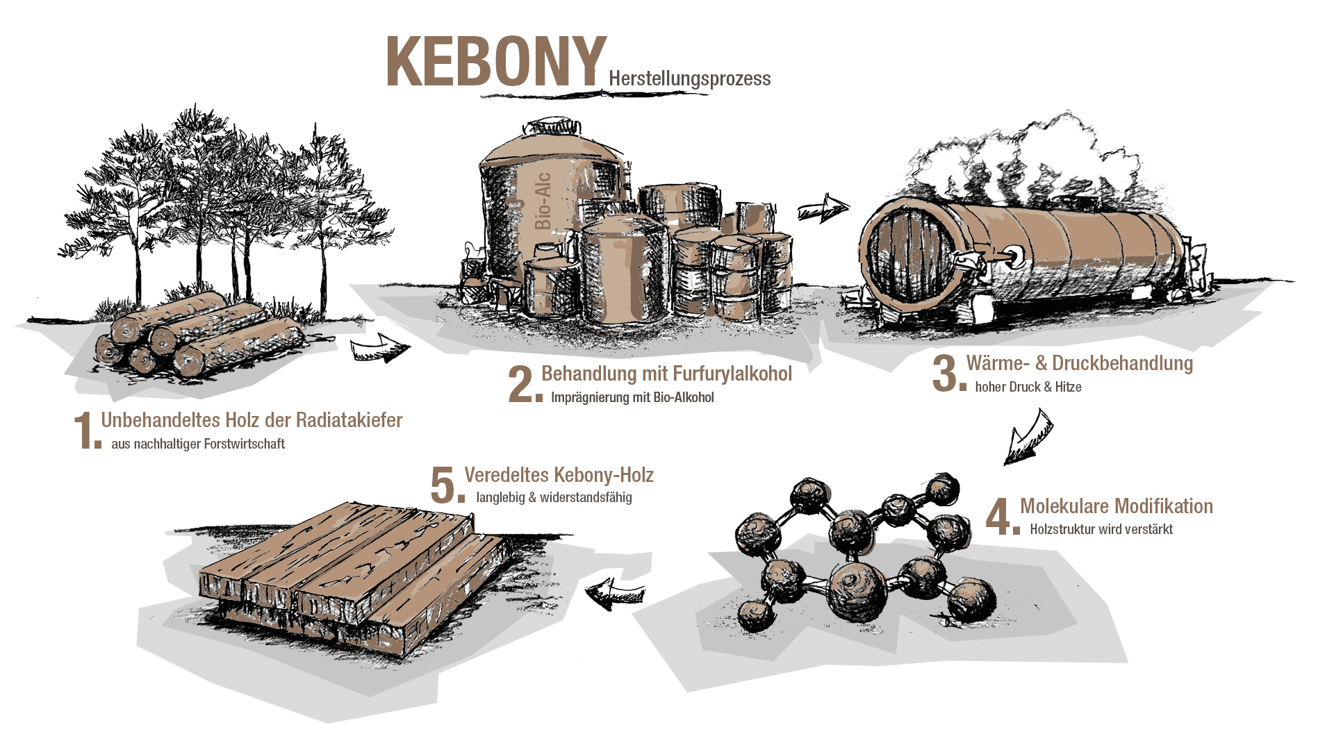 - Dieses Nebenprodukt aus der Zuckerproduktion wird unter Druck in die Zellwände des Holzes gepresst