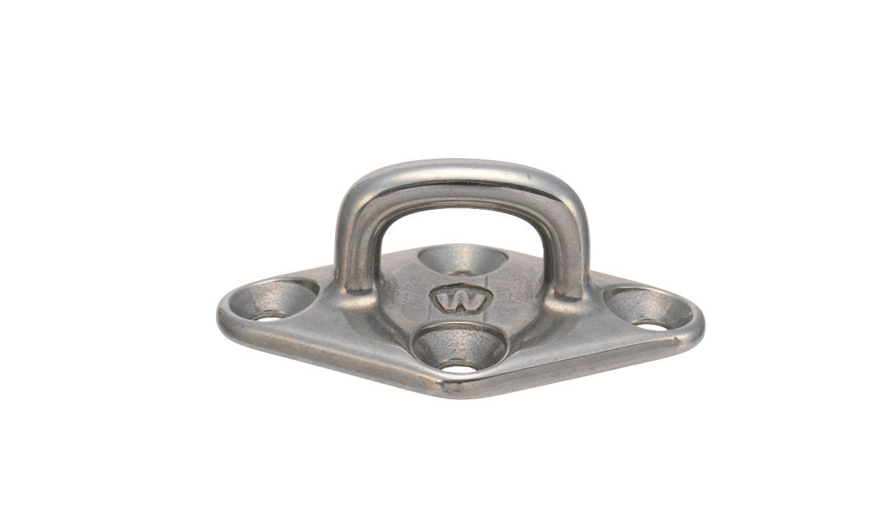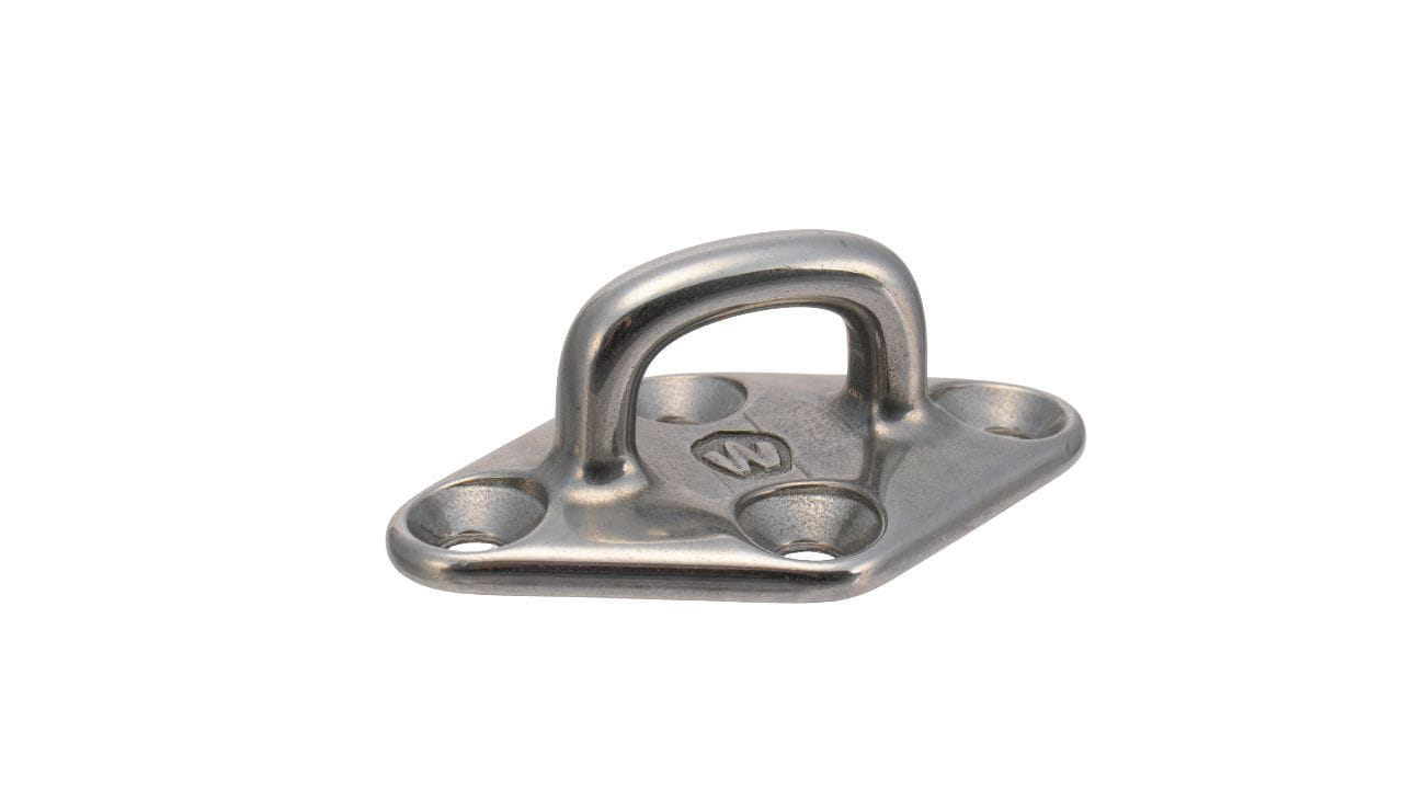 Hoogwaardig dekoog met ruitvormige grondplaat en hoekig oog. Gesmeed uit duplex roestvast staal met hoge corrosiebestendigheid en mechanische sterkte. Gecertificeerde breuklastgegevens.