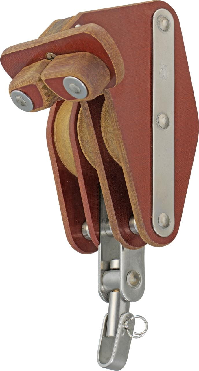 Zierlicher Flaggleinenblock oder Schlüsselanhänger. Blockgehäuse aus Teakholz, Beschlag aus rostfreiem Edelstahl, Messingscheibe und Edelstahl - Achse.